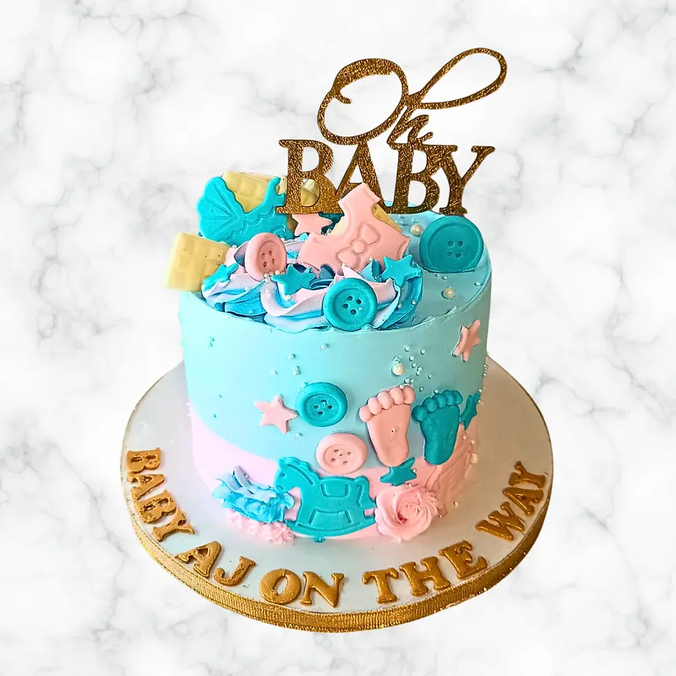 "Celebrating sweet beginnings! 🎉 This adorable baby shower cake, adorned with pastel colors and cute decorations, is the perfect centerpiece for welcoming the little one into the world! 💖👶"